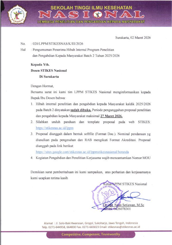 • Opening Hibah Internal Penelitian dan PKM STIKES Nasional Kaldik 2025-2026 Batch 2