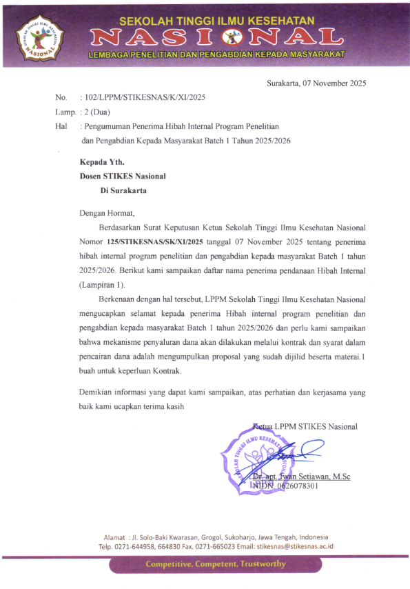 Berdasarkan Surat Keputusan Ketua Sekolah Tinggi Ilmu Kesehatan Nasional Nomor 125/STIKESNAS/SK/XI/2025 tanggal 07 November 2025 tentang penerima hibah internal program penelitian dan pengabdian kepada masyarakat Batch 1 tahun 2025/2026. Berikut kami sampaikan daftar nama penerima pendanaan Hibah Internal yang dapat di unduh pada link Berikut: UNDUH DISINI