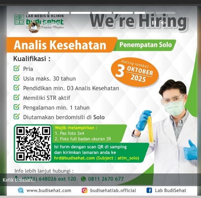 Lowongan Pekerjaan Analis Kesehatan Laboratorium Klinik Budi Sehat