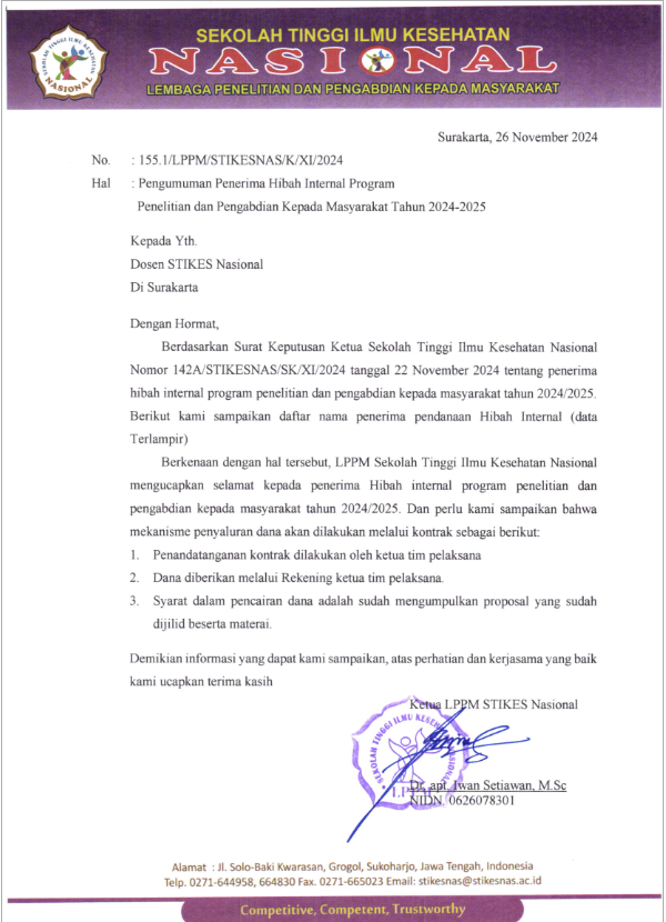 - Opening Hibah Internal kegiatan Pengabdian Kepada Masyarakat STIKES Nasional Semester Genap Kaldik 2024-2025